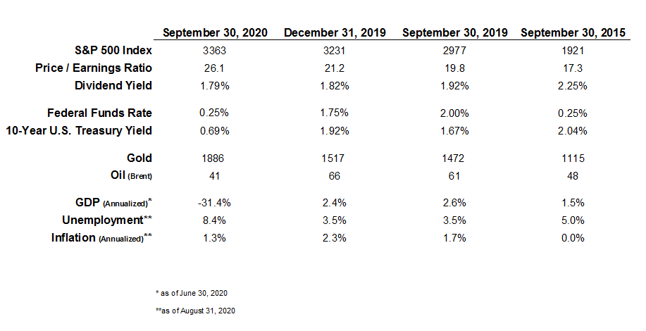 That said, the Federal Reserve, an unelected committee, has had a remarkable impact on investors’ expectations for decades, and since the Great Recession, it has been argued that the Fed’s ultra-loose monetary policy has pushed investors into risker assets, thereby driving up their prices and possibly distorting financial markets. As we have noted in prior quarterly commentaries, the Fed has spent trillions of dollars this year buying bonds of all types. The Fed recently changed its ‘framework’ for fighting downturns like the one we are currently in; it will wait for inflation to actually arrive, as opposed to potentially arrive, before raising interest rates. This implies that interest rates will stay lower, for longer, suppressing the return on cash and other safe assets.
