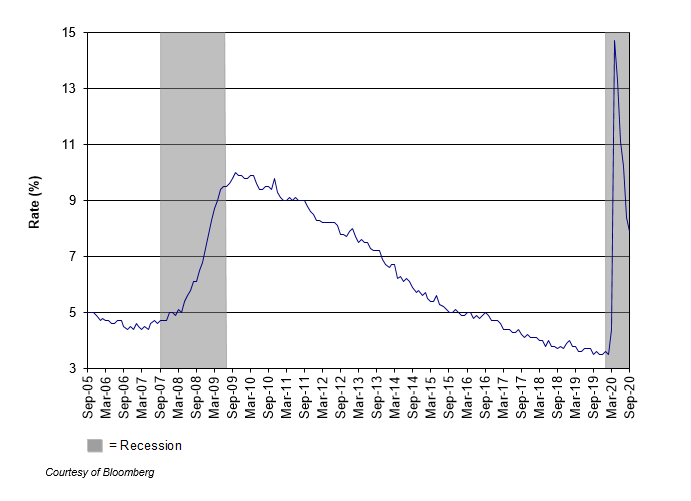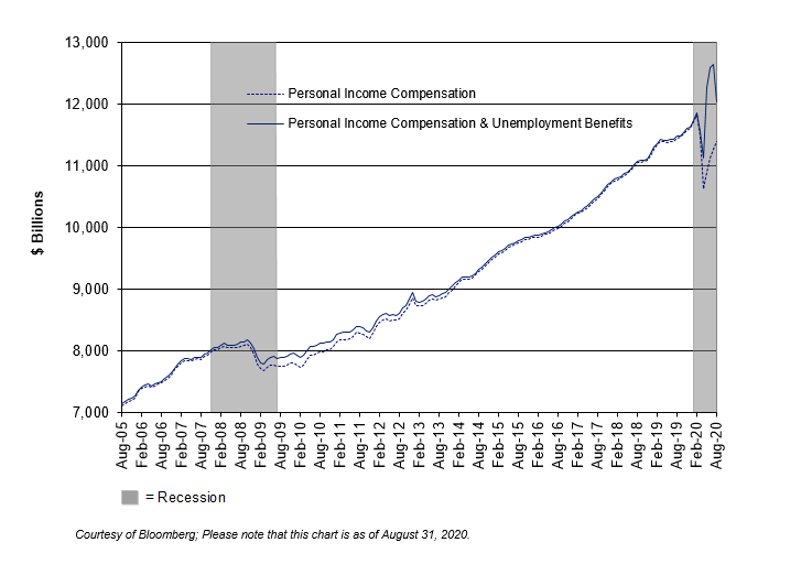 Unlike previous downturns, Government unemployment and stimulus benefits have been so significant in 2020 that they initially increased total employee compensation. These payments began to decline in August.