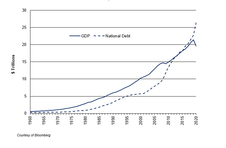 Total U.S. national debt has rapidly overtaken aggregate gross domestic product (GDP) during the downturn.