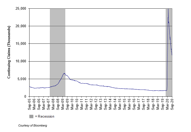 After peaking in May, continuing jobless claims have declined by roughly half, but remain at extremely elevated levels.