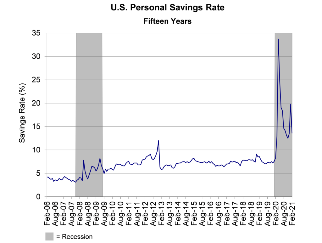 Mitchell Sinker & Starr has been consistent in our belief that a short-term, temporary increase in inflation may be inevitable due simply to the fact that pent-up demand and strong household balance sheets (see graph below) may create massive short-term demand. However, any inflationary effects are likely to be temporary, as an anticipated surge in consumer spending would be a one-time event on the way to a more normalized economy. After all, pent-up demand is finite and so is the extra cash consumers have on hand. Americans may buy more for a time but are in no position to reset the dial on spending in the long term.