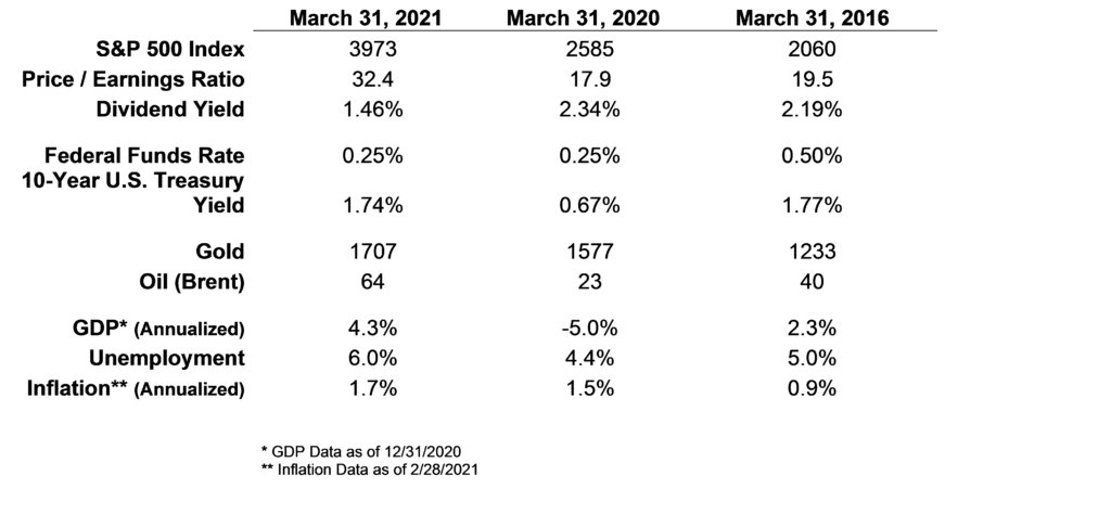 Stocks climbed higher in the first quarter of 2021, as the pace of vaccinations increased and the economy showed additional signs of reopening. Unlike 2020, the upward move was driven by broad assortment of stocks in all sectors, rather than a handful of the largest technology companies.