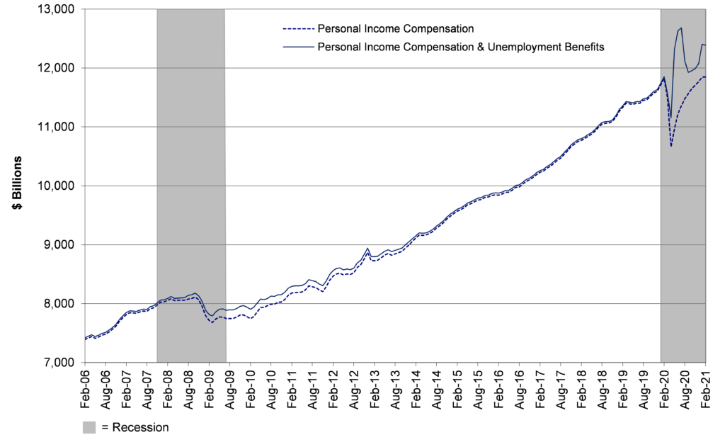Total monthly compensation remains above pre-COVID levels primarily due to ongoing government stimulus measures.