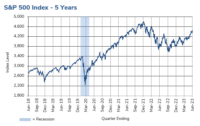At the same time, bond yields stabilized as the Federal Reserve paused 15 months of interest rate hikes in May. This stability was largely due to lower inflation; after peaking at more than 9% last summer, U.S. inflation ended the quarter at 3%. (Note that this does not mean overall prices are falling, only that they are rising less quickly than twelve months earlier.)
