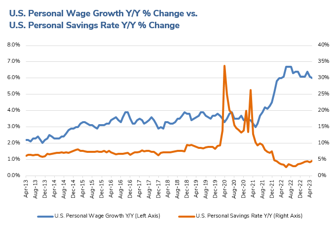 The personal savings rate of the U.S. consumer spiked to all-time highs during the first wave of COVID, fueled by government stimulus payments, pandemic loans, and initially the general inability to spend money on much of anything (including toilet paper). Savings rates have now retreated to their lowest levels since the Great Recession, making it just a matter of time until reserves are gone and the consumer is tapped out. However, at the same time, a tight labor supply since 2020 has led to above-average wage growth for American workers, which now outpaces inflation for the first time in years. This wage growth could continue to drive additional spending in excess of what economists have forecasted in the short term.