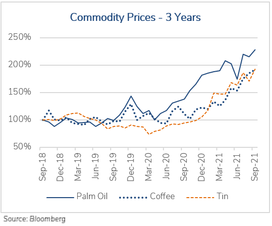 To combat Delta, Asian governments re-implemented stringent lockdowns, throttling production just as demand soared. In other words, while the West was reopening and demanding goods at a record pace, the factories in the East were still experiencing intermittent 2020-style lockdowns, exacerbating the imbalance between production and consumption. One result was a dramatic increase in the price of raw materials and other inputs. For example: