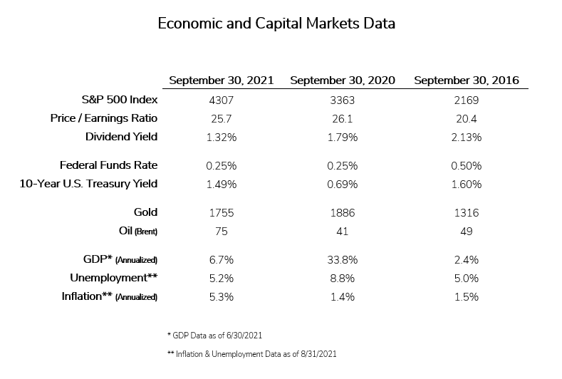 Building on gains from the first half of the 2021, U.S. stocks continued to move higher through the summer before stalling in September. This pause, in what had been a meteoric rise since March of 2020, in large part reflected concerns about the COVID-19 Delta variant, which continued to snarl global supply chains, causing investors to reevaluate their expectations for inflation and global growth.