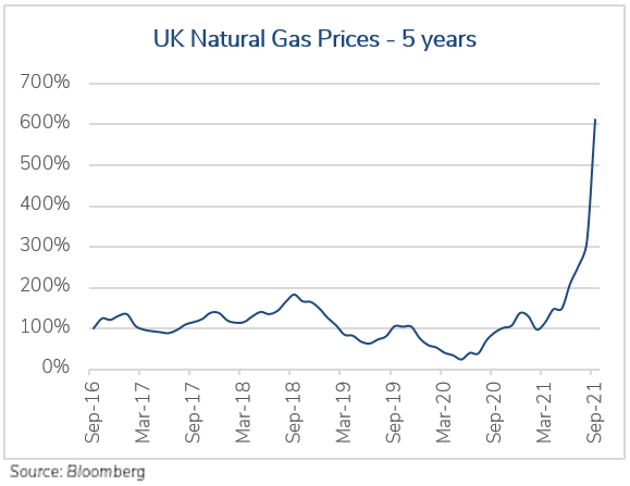 Production requires energy, and energy costs have also risen as demand has picked up, in some cases not related to COVID at all. In Europe, hot summer temperatures increased the demand for electricity just as North Sea wind energy production decreased drastically. Stockpiles of natural gas were then drawn down, leading to higher natural gas prices heading into the winter months. In addition to costing consumers more to heat their homes, this spike could have a ripple effect. For example, it has already increased fertilizer costs in Europe, which could lead to increased costs for farmers and higher food prices for consumers.