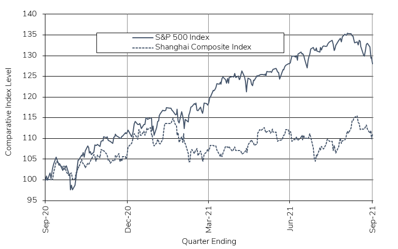 The Chinese real estate market and its potential impact on the global banking system is one situation we are monitoring. In China, real estate is a much larger percent of the economy than it is in the U.S. A major Chinese real estate developer, Evergrande, faces possible bankruptcy. Outside of the impact on China’s real estate and banking sectors, such a large bankruptcy could dent global investors’ willingness to take risk. (To date, U.S. banks have indicated they have no exposure to Evergrande debt.)
