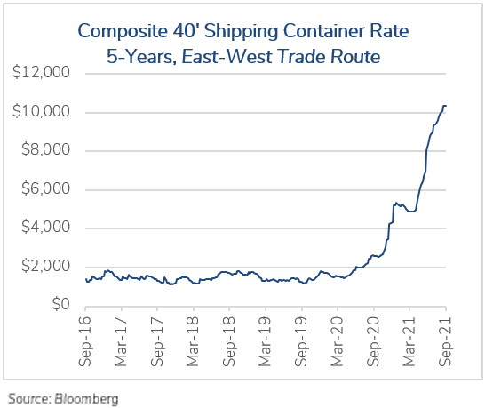 In the first quarter of 2021, as the U.S. economy reopened and consumer demand for goods and services far outpaced the available supply, Asian manufacturers, who supply most of the world’s goods, started to increase production. But the vaccine rollout in Asia lagged that of the rest of the world, creating the perfect opportunity for the highly contagious Delta variant (now the dominant COVID strain worldwide) to cause greater disruption in these countries.